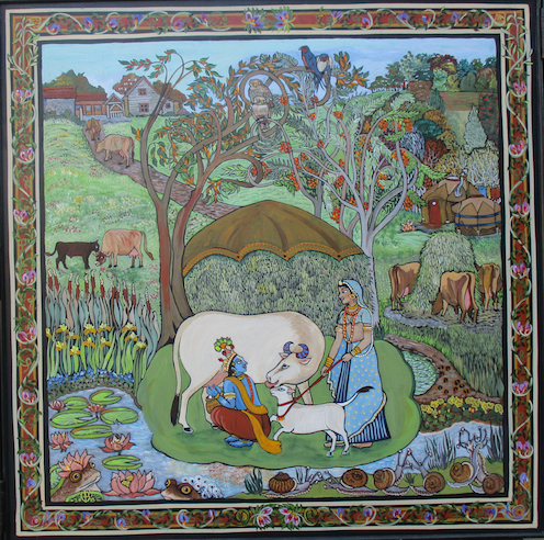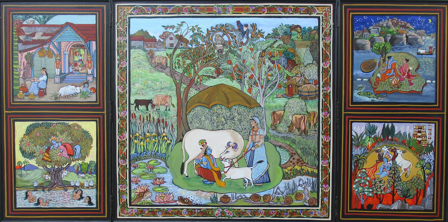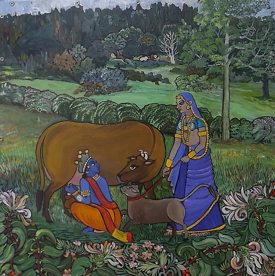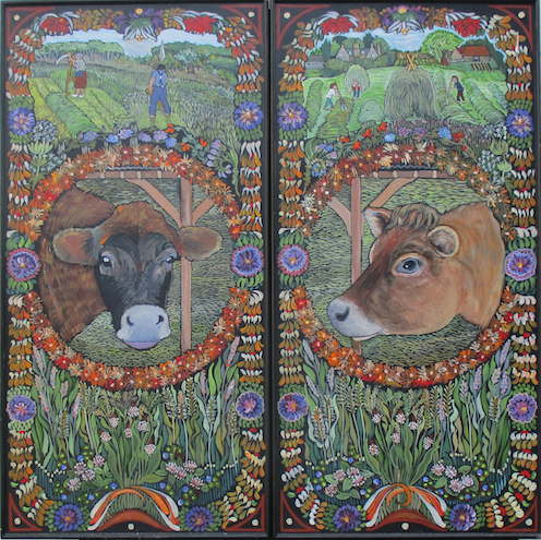 There are, I think, nineteen cows altogether in this triptych which is about three feet square when folded up. It shows famous stories from the life of Krishna Govinda, Krishna the Cowherd. It was commissioned to hang on the milking-parlour wall at Monkton Wyld Farm, as entertainment for the farm cows. (That’s Folly and CoCo on the front). But the parlour is too dark for such detail so I painted another for them, showing Adrian’s Field where we often milk outdoors in summer:
