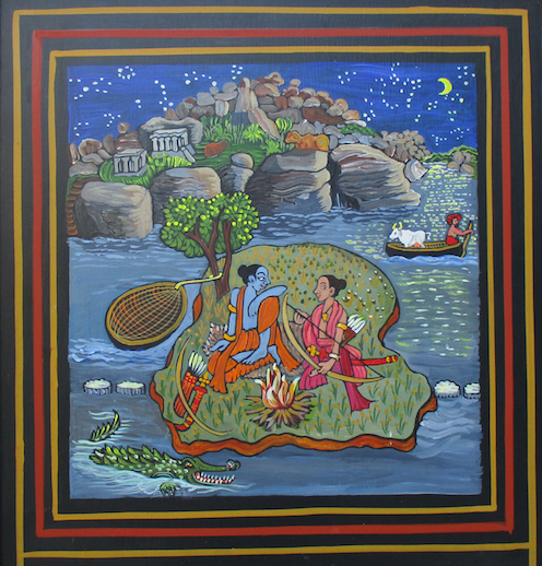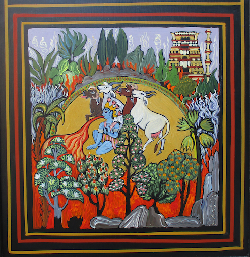 Left: Krisna swallows the forest fire to save the cows. Right: Travelling in search of Sita, who has been stolen by the demon Ravanna, Krisna and his brother Balaraman camp the night on an island in the crocodile-infested Tunghabadra river at Vijayanagar, aka Hampi, where coracles are the no. 1 means of transport. Other paintings of Hampi, with its monumental boulders, can be seen on the India page.