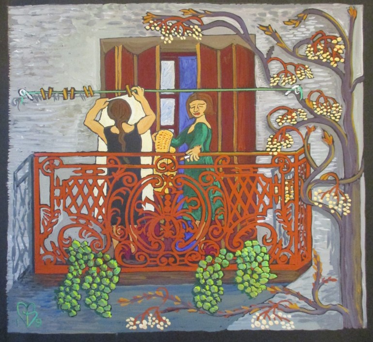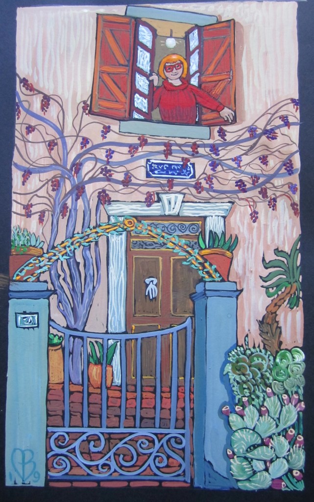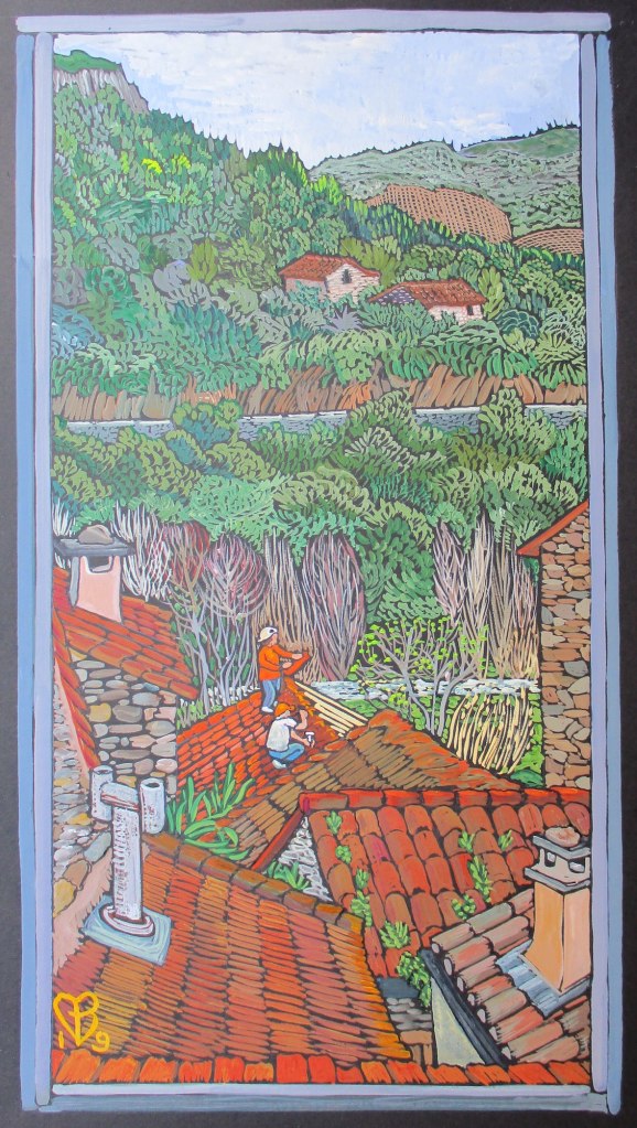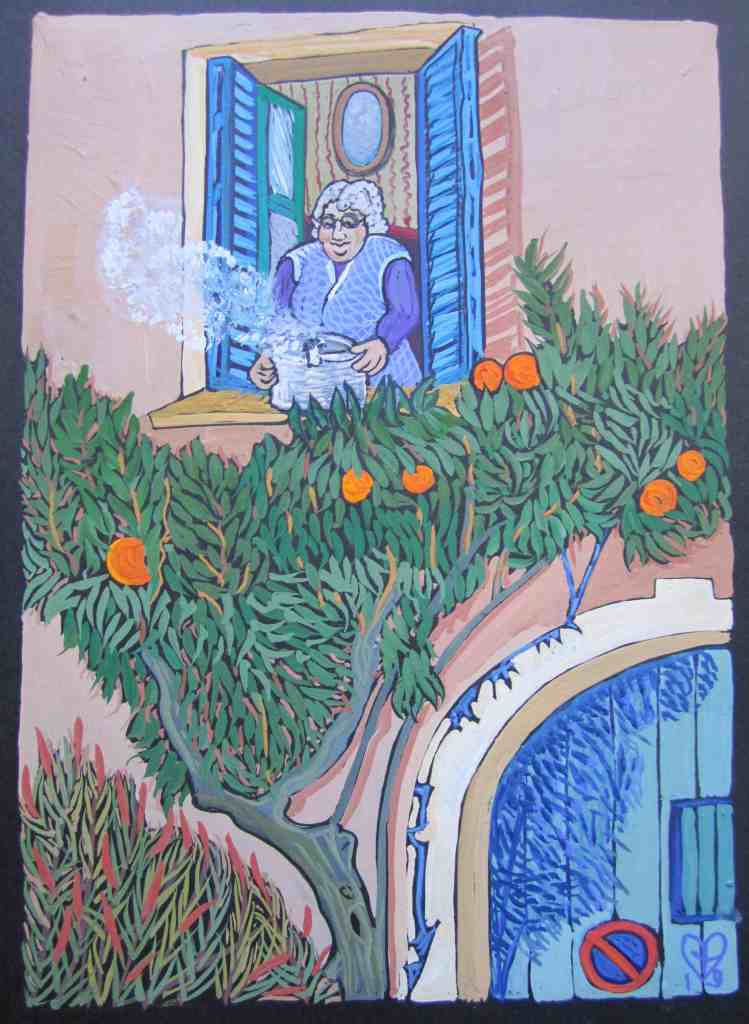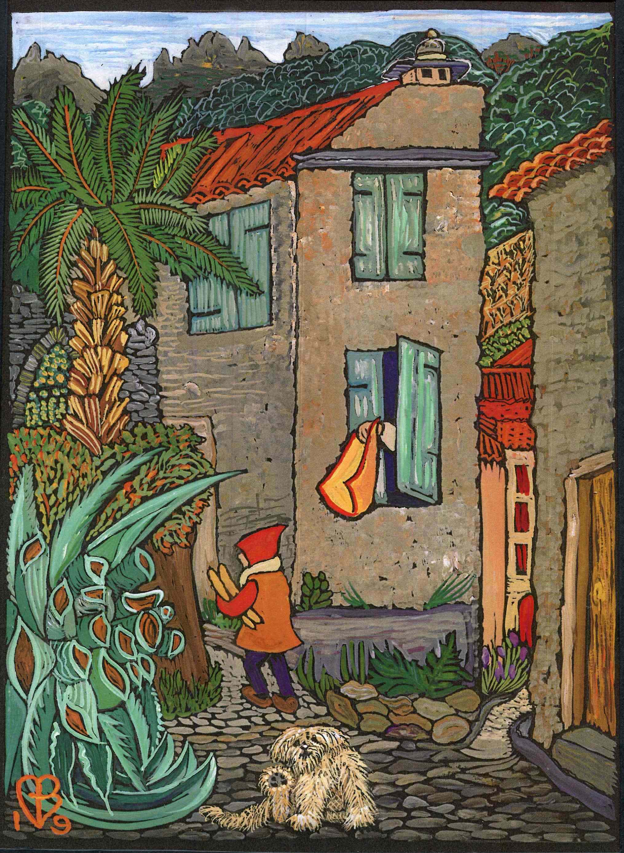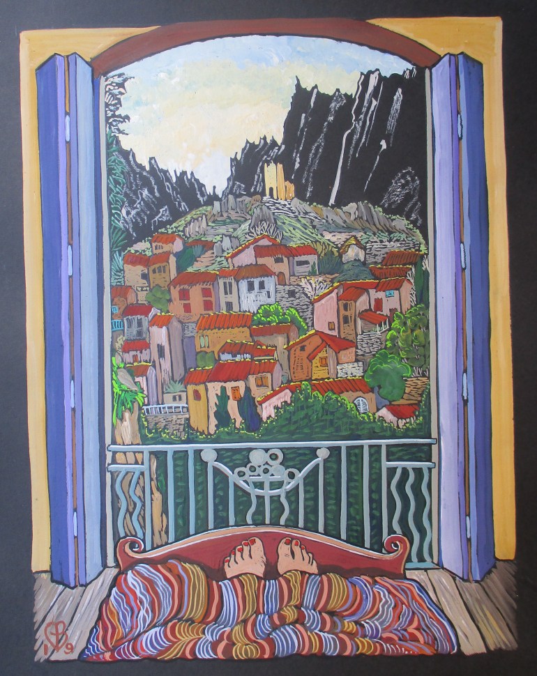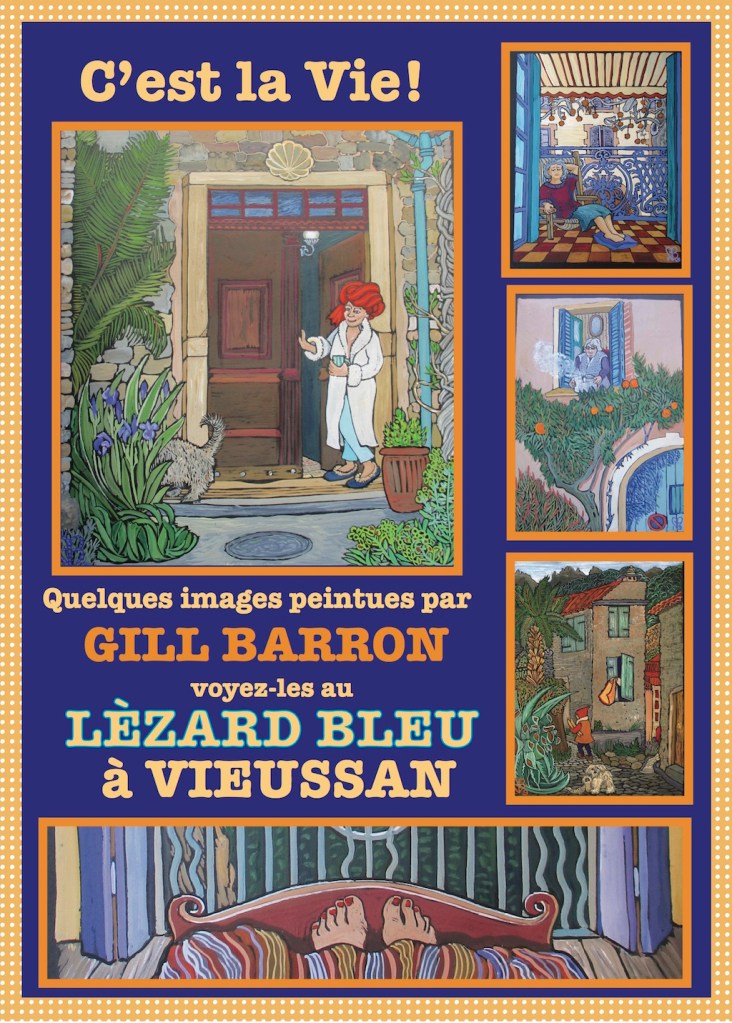 These gouaches, from early 2019 in the Haut Languedoc (more to come) are a sort of spoof on the mediaeval prayer-book “Les Très Riches Heures du Duc de Berry”. These instead celebrate the everyday Heures of rather ordinary ladies. They were exhibited at Le Lezard Bleu in Vieussan for a year; here is the poster, a book cover design; and pics, below. Prints are available; email me to enquire. For more Mediterranean images see the Ipaint Archives page.